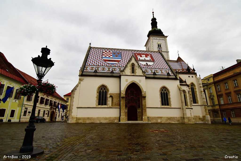 The colorful tile roof on the Church of St. Mark depicts two coats of arms. The walled city on the right is the seal of Zagreb. On the left, the red white checkbox symbolizes north-central Croatia, the three lions’ heads represented the Dalmatian Coast and the marten running between two rivers is Croatia’s northern inland.