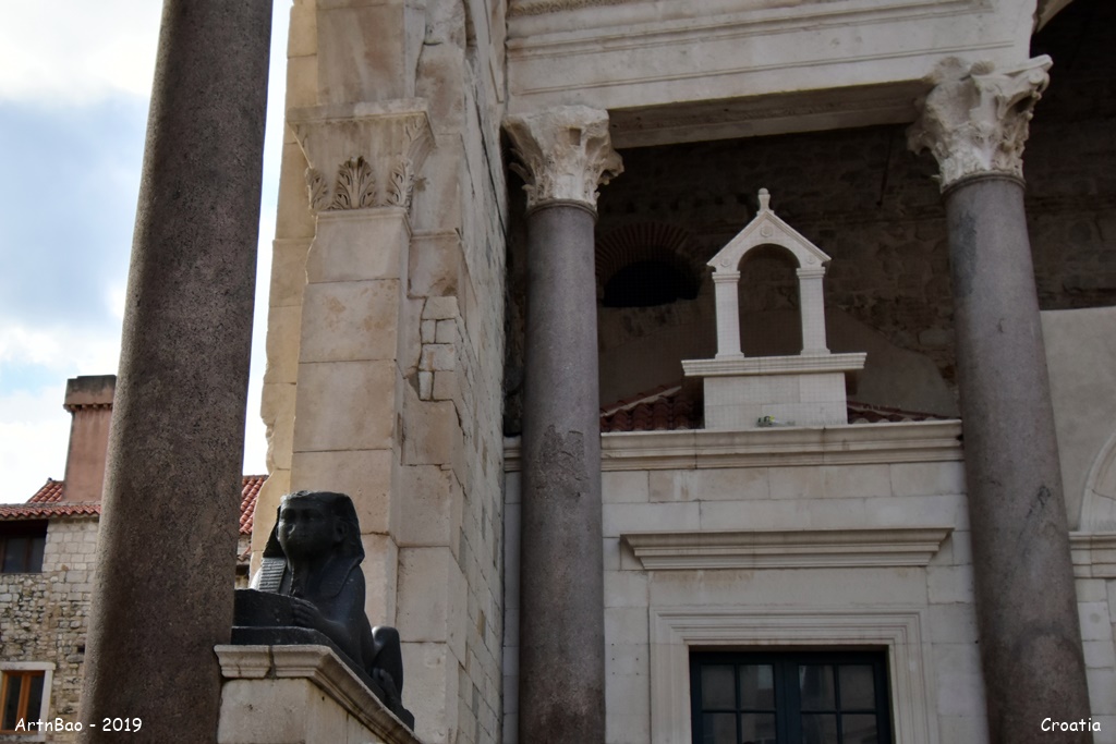 Go to the center of the main square, Peristyle (Peristil), and looked at the surrounding architecture. Look out for the only intact black granite sphinx that was brought back from Egypt by the Diocletian. The red granite pillars were also from Egypt.