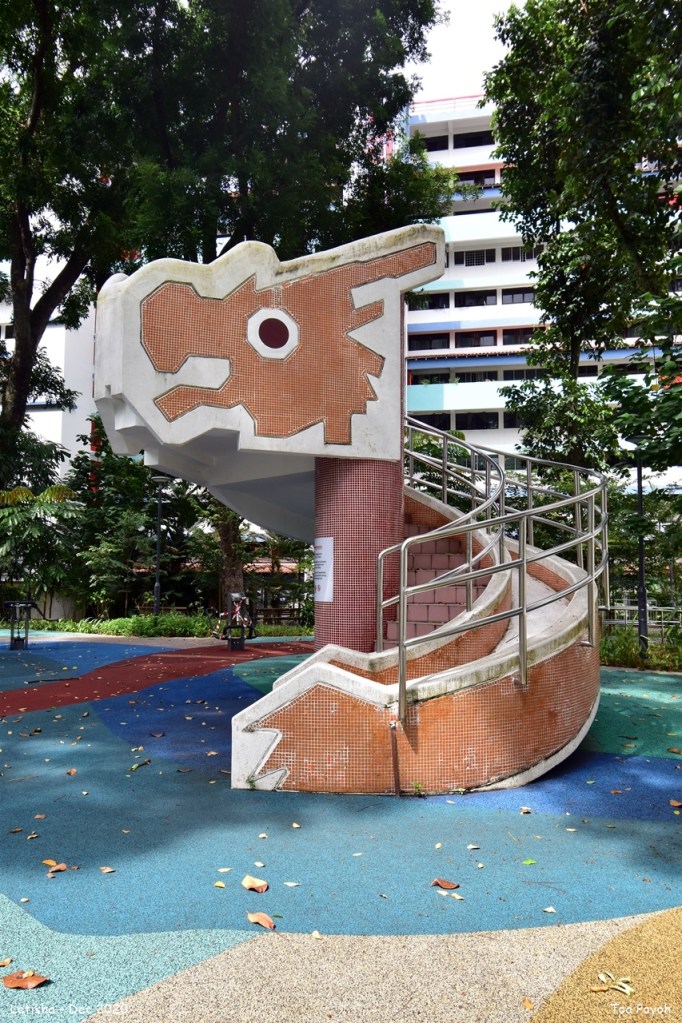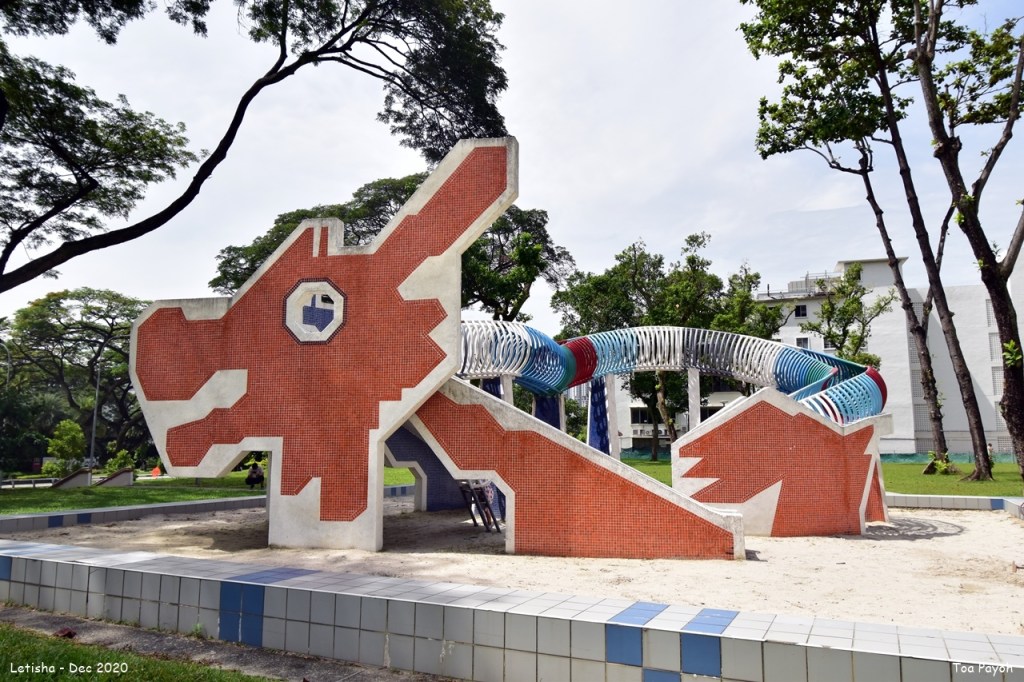 The Dragon playground, designed by Mr. Khor Ean Ghee, was built in 1979. It is one of the iconic landmarks in Singapore today. After some feedback with the initial design, the current layout evolves. The larger head tiled with terrazzo and glass in red, orange, blue, and green is featured. The colorfully painted steel ring body allowed children to climb or slide through it. It is one of the two dragon playgrounds remaining and is the only one that retains its original sand surfaces.