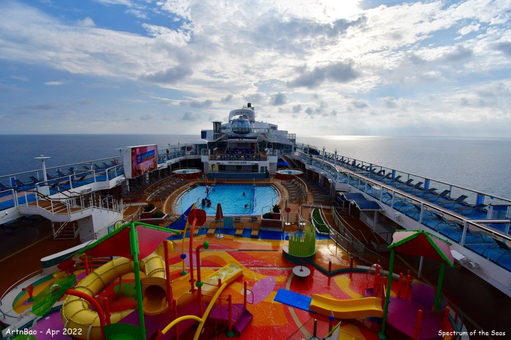This is one of our favorite places onboard. Lie on your back and relax in the cool and open space with the best view. Or get yourself soaked in the pool or jacuzzi with a drink. This adult-only lets you have some peaceful moments.