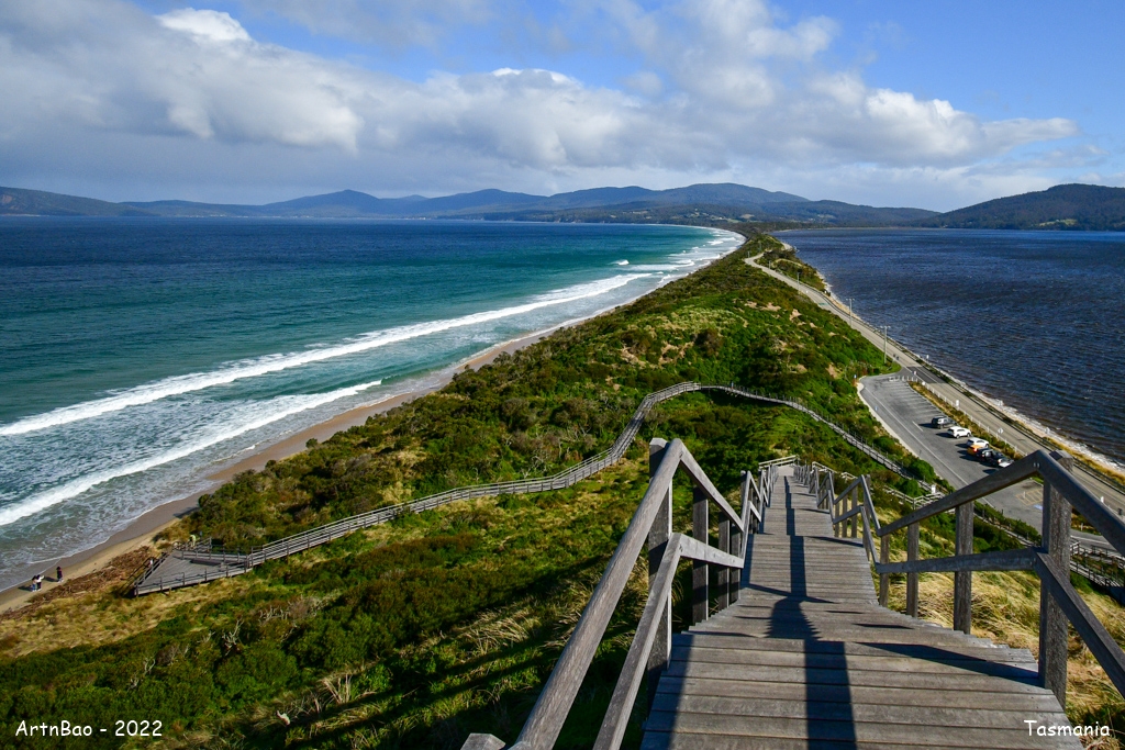 The Neck is an isthmus of land that connects the north and south Bruny island. We climb the wooden stair that leads to the lookout platform for a stunning view. Beware that the wind may be strong and slow down your pace.
