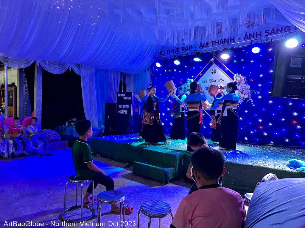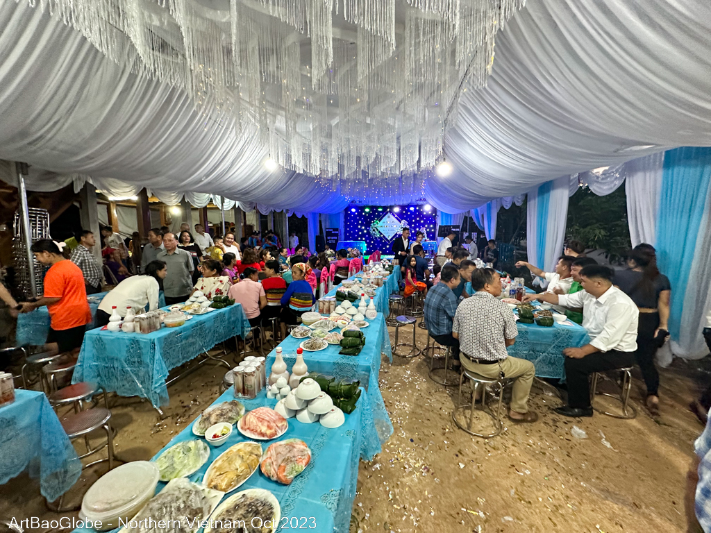 A village wedding banquet is a village event as everyone helps in the preparation. It is also a time for everyone to feast and party. The families and friends would dress up in their traditional costumes. The elderly in the family would gave the gifts to the couple on the stage. Watched the local culture dance performance while feasting. Sang and drank almost all night.
