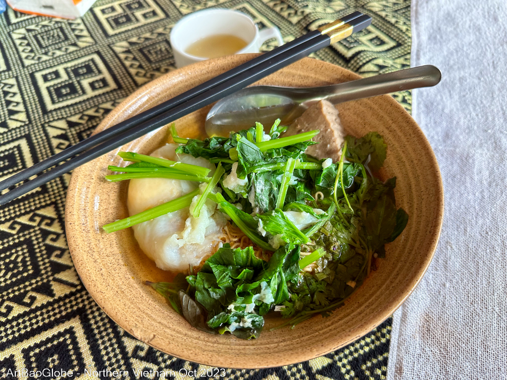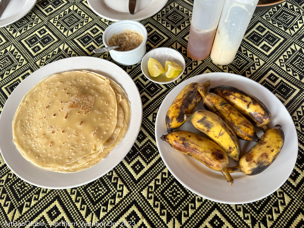 We had a bowl of hot noodle soup with freshly picked vegetables from the field and a banana pancake for breakfast.