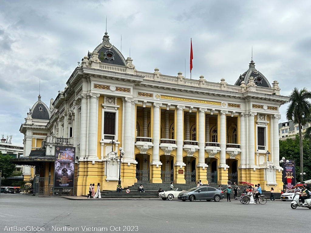 The French Quarter has less traffic than the Old Quarter, with wider streets and a mix of French and European-style buildings. The Opera House, a creamy yellow building, stands out as the most prominent.