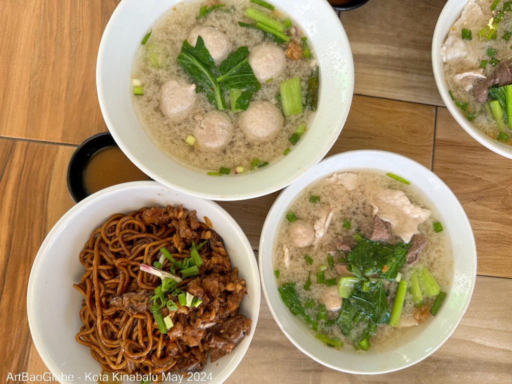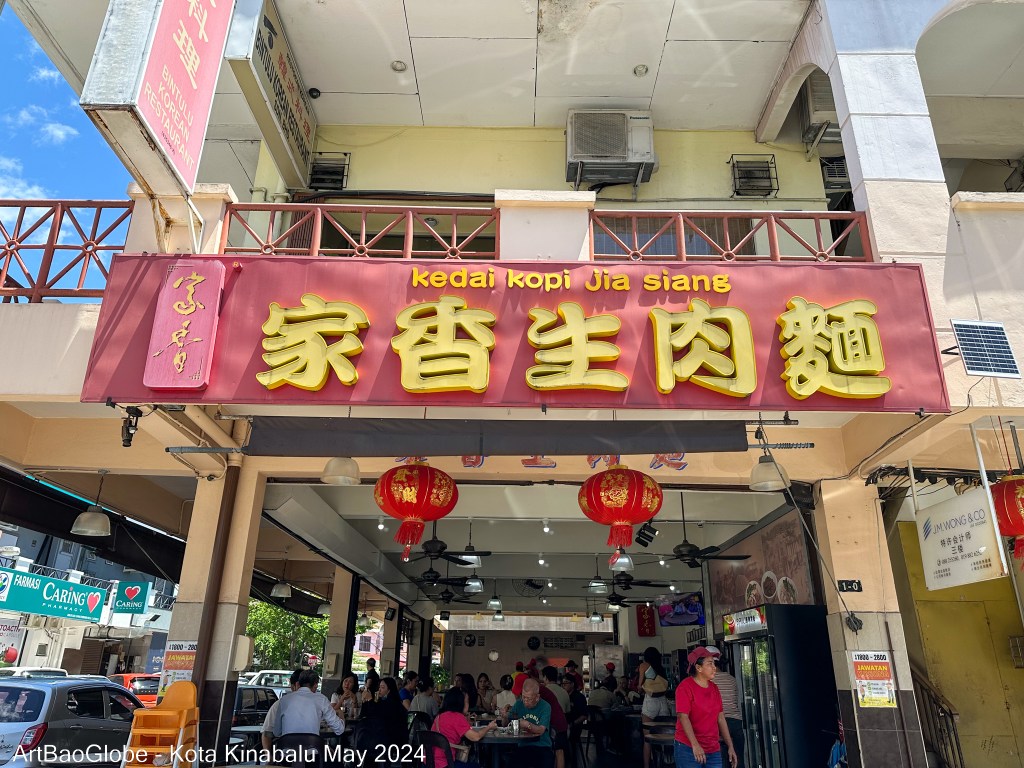 Jia Siang Coffee Shop is known for its pork noodle, which originated in Tawau, Sabah. The dry version features noodles mixed with dark soy sauce and pork oil, served with a flavorful pork slice and ball soup.