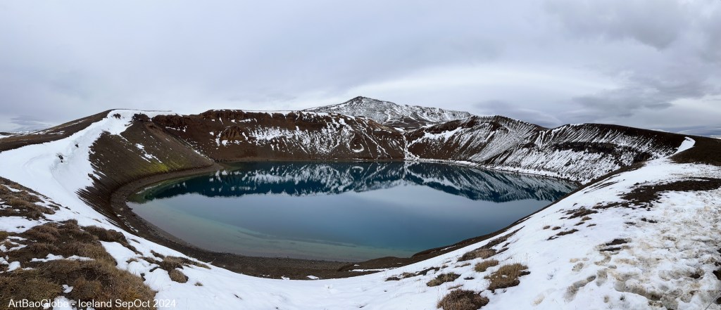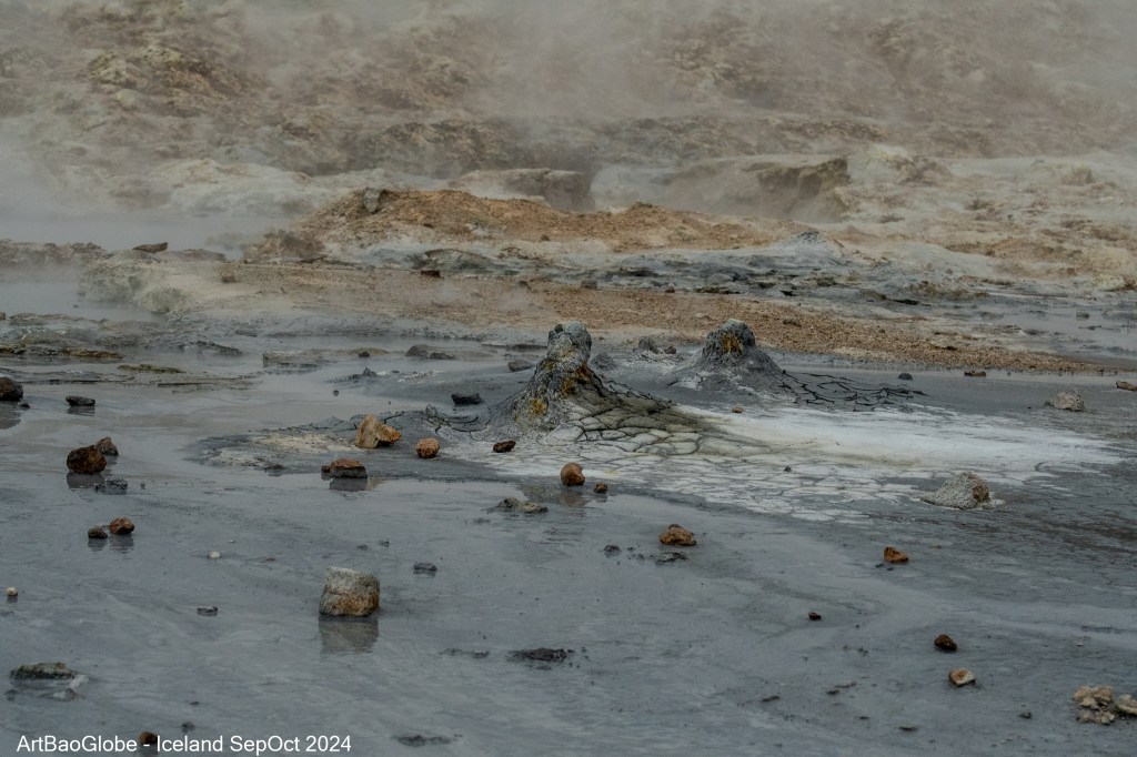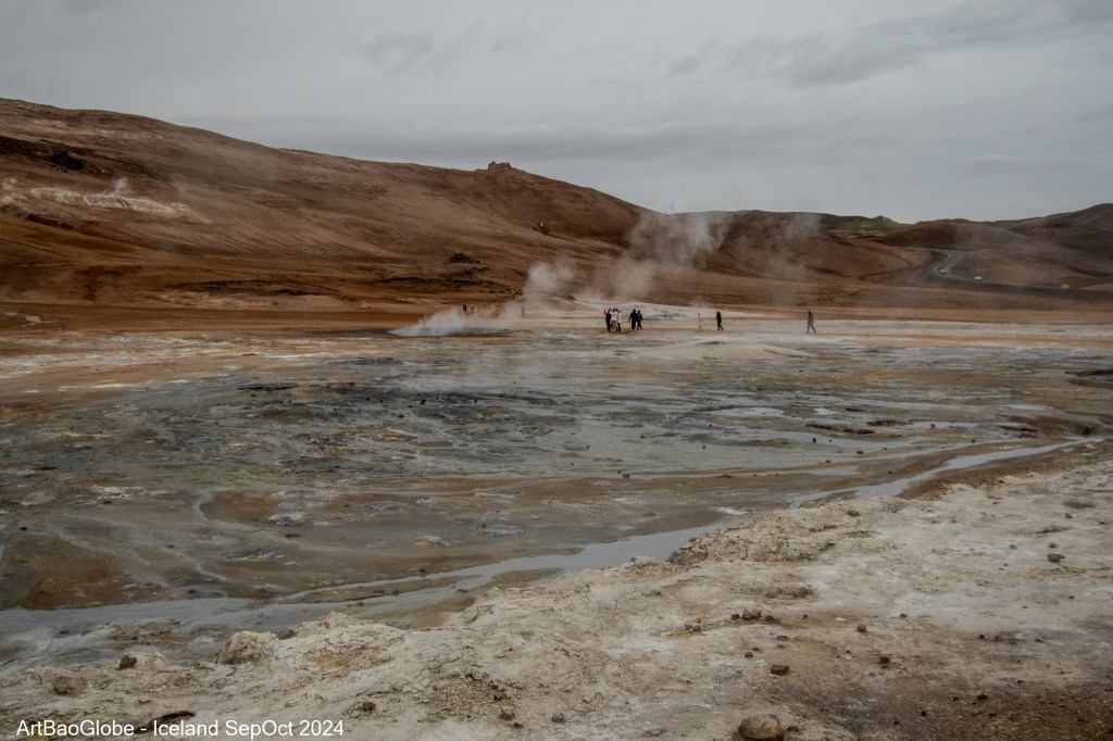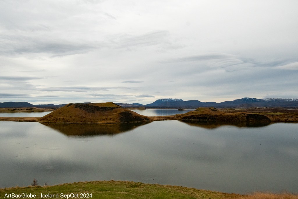 Our first stop was Skútustaðagígar, home to one of Iceland rare and fascinating geological features: pseudocraters. These unique formations are the result of an extraordinary interaction between water and lava. Pseudocraters form when molten lava flows over a wet surface, such as a lake or marshland. As the trapped water beneath the lava begins to boil, the buildup of steam creates intense pressure. This pressure eventually leads to explosions, where the steam escapes violently to the surface. The repeated eruptions tear apart the overlying lava, piling the fragmented material around the steam vents and shaping the characteristic crater like structures. Standing among these remarkable formations, it was awe-inspiring to think about the powerful forces of nature that sculpted this surreal landscape. Skútustaðagígar offered a fascinating glimpse into Iceland’s volcanic history.