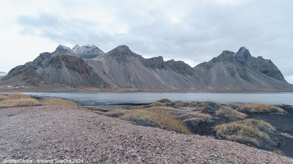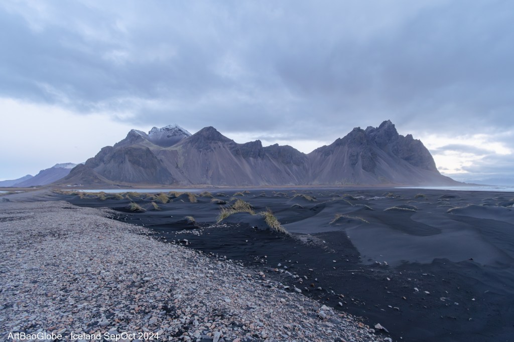Vestrahorn, towering 454m high, is known for its two distinctive peaks and is located on the Stokksnes Peninsula, near Höfn. Unlike most Icelandic mountains, it is composed of iron and magnesium rich gabbro rock, giving it a dark, jagged appearance. Facing the sea on its southern side, it is surrounded by a stunning black sand coastline, a striking result of Iceland volcanic activity. Its name, Vestrahorn, translates to “West Mountain” in contrast to its neighboring peak, Eystrahorn, or “East Mountain”. The howling wind added to the raw beauty of the scene, making Vestrahorn feel even more wild and untamed. Powerful gusts swept across the landscape, lifting fine black sand into the air. We could feel tiny grains stinging our faces, a humbling reminder of nature sheer force. Despite the harsh conditions, the breathtaking scenery made every moment worthwhile.