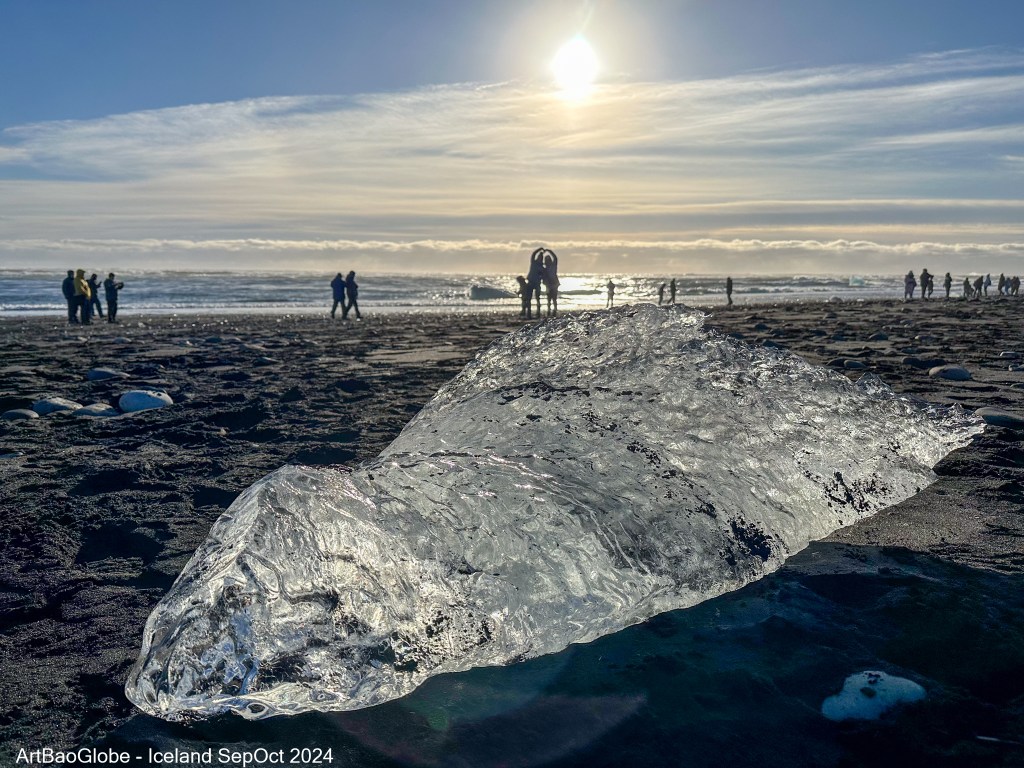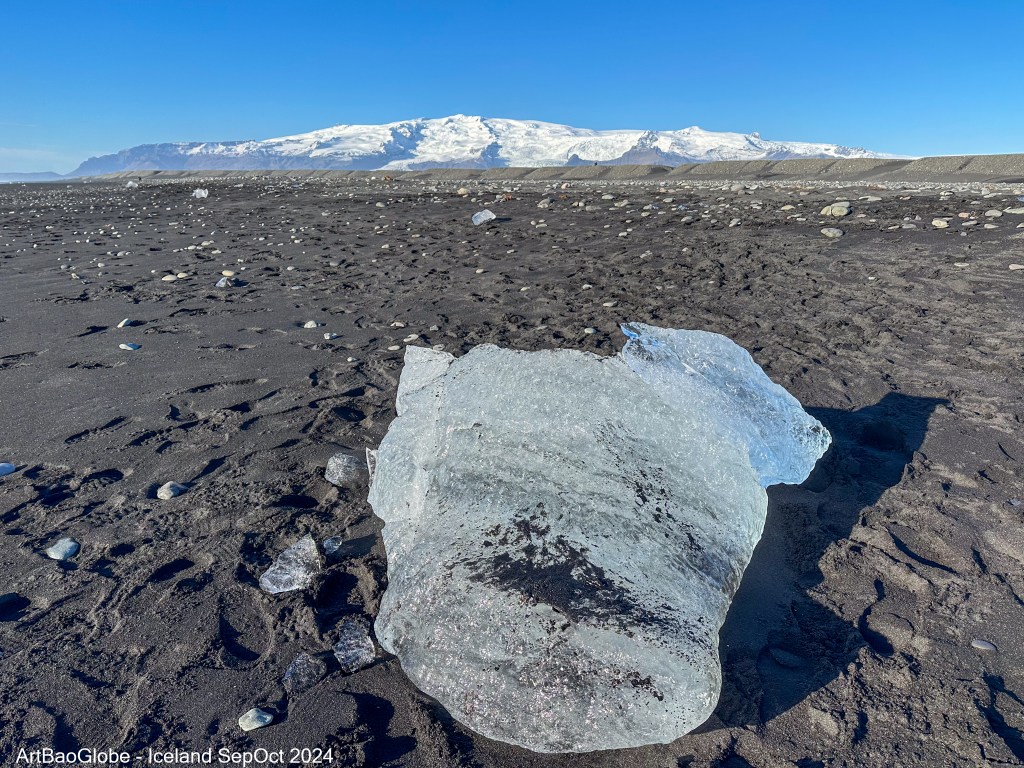 We took a leisurely stroll along Diamond Beach, hoping to see its signature glittering ice formations. However, on the day of our visit, there weren’t as many “diamonds” scattered around perhaps blown away by the previous day storm. Nevertheless, the few icebergs that remained were mesmerizing, so crystal-clear that sunlight shone straight through them, making them look like giant, glistening diamonds set against the black sand.