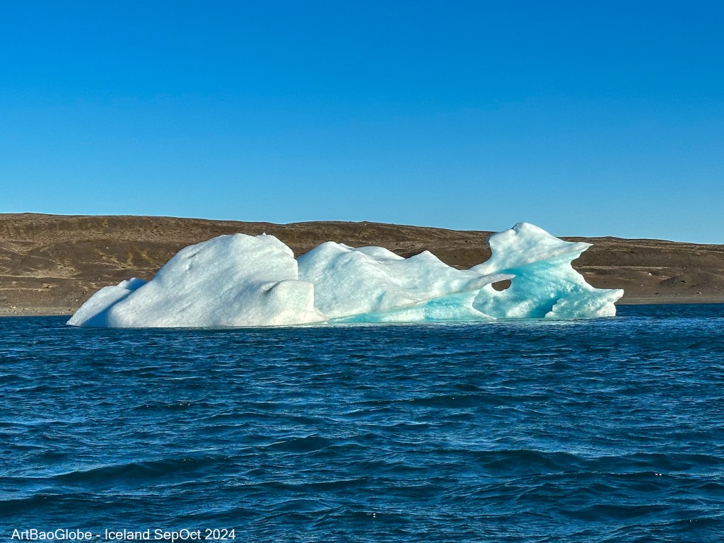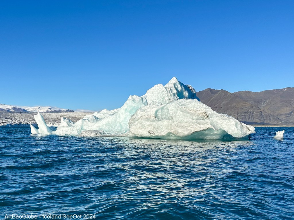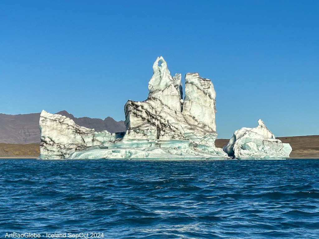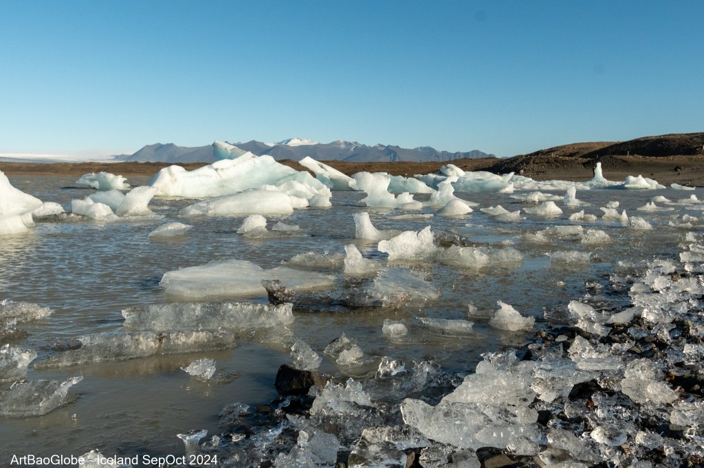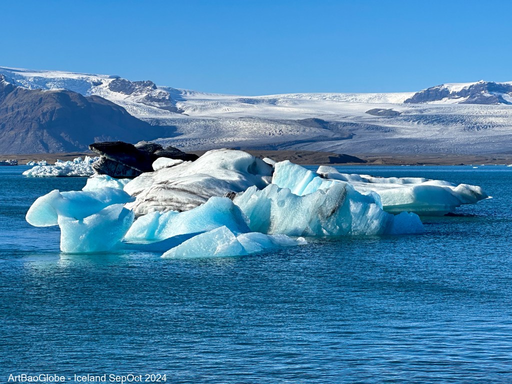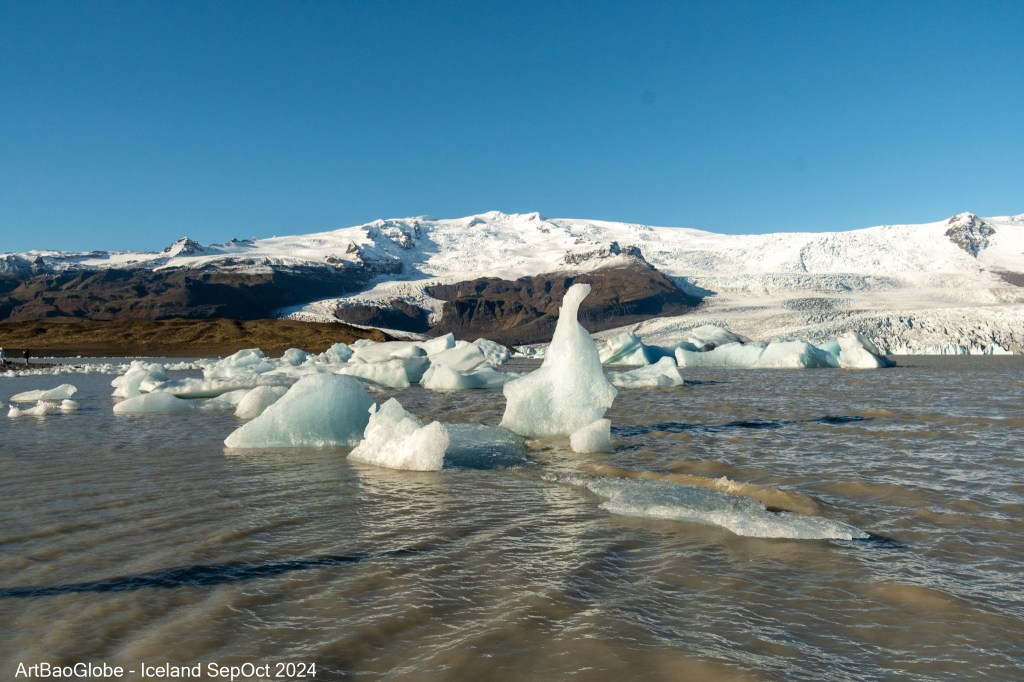 The lagoon connects to the Atlantic Ocean and is composed of both seawater and freshwater, giving it its unique, striking color. At times, seals can be spotted swimming gracefully through the icy waters. As icebergs calve from the glacier, they slowly drift through the lagoon, gradually melting. Some are carried out to sea, while others wash ashore at Breiðamerkursandur, the stunning black sand beach. This shoreline, often covered in translucent, compact ice sculptures that glisten in the sunlight, has earned the name Diamond Beach.