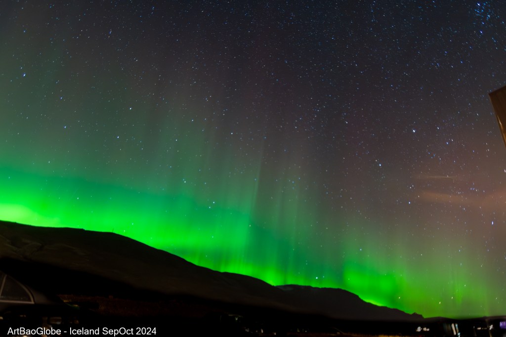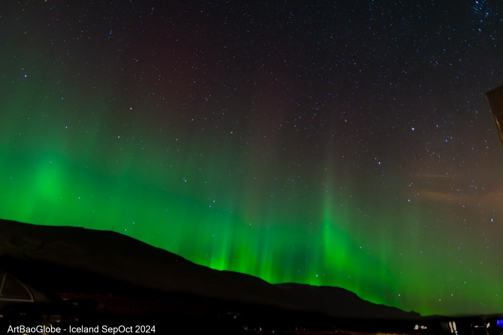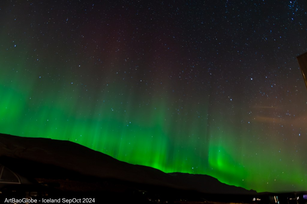 We peeked through the window and saw countless stars twinkling in the night sky. Hoping to catch another glimpse of the Northern Lights, we headed to one end of the hotel building, where we could shield ourselves from the wind and get a clearer view. Before long, the aurora began to emerge, faint at first, then gradually intensifying, stretching from left to right and illuminating the sky above the mountain ridges. It was another breathtaking, jaw-dropping display of Lady Aurora, an unforgettable moment of pure wonder.