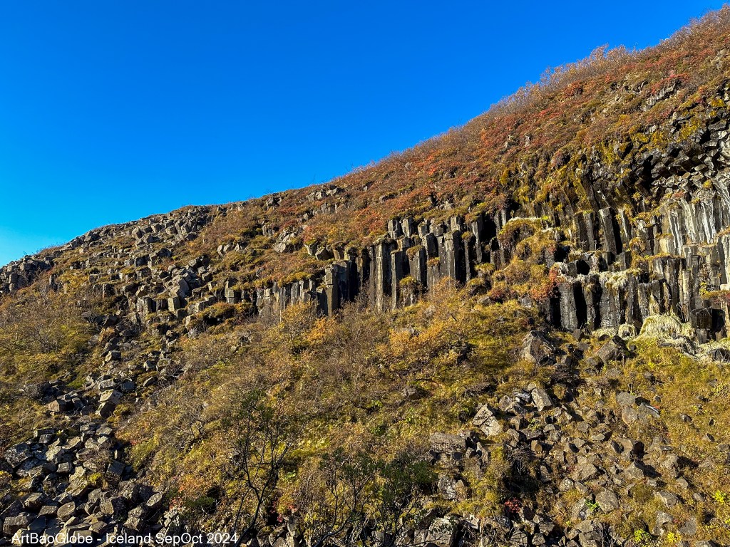 The hike to Svartifoss starts at the visitor center and follows a gradual uphill trail, covering 1.5 km one way (3 km round-trip). It’s an easy and enjoyable walk, typically taking around 1.5 hours at a leisurely pace. In early October, the trees lining the path were painted in vibrant autumn hues, adding a warm contrast to the rugged landscape. Midway through the hike, we came across Hundafoss, a picturesque waterfall with a designated viewing platform offering a fantastic vantage point. With breathtaking scenery, crisp mountain air, and unique plant life along the way, the entire hike was a memorable and rewarding experience.