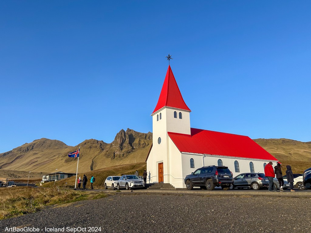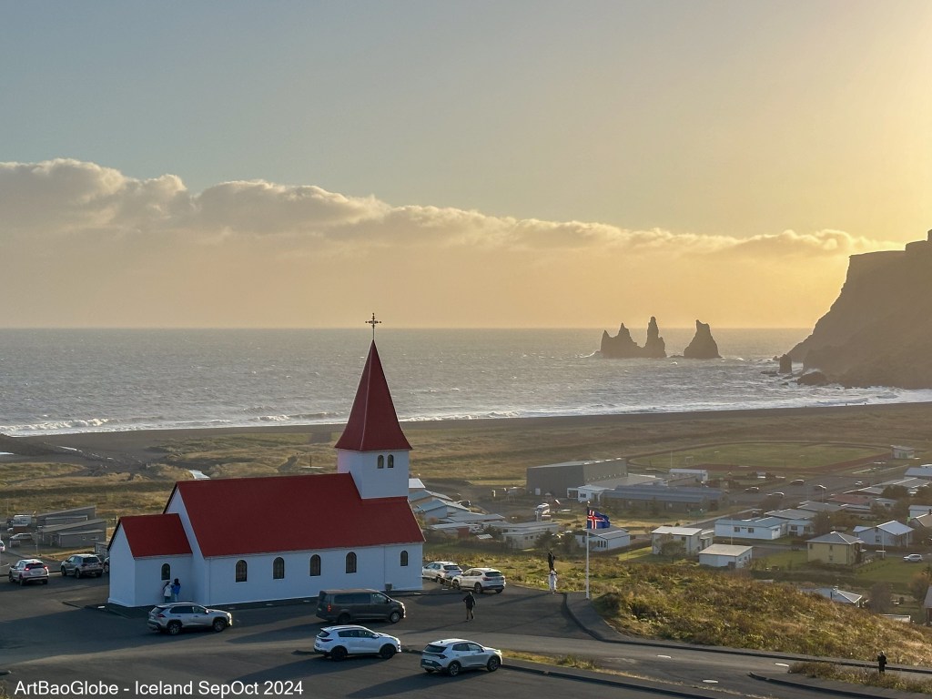 A must do in Vík is to drive up to the hilltop for the iconic photo spot : The Church of Vík with the breathtaking backdrop of the town, coastline, and the famous Reynisdrangar basalt sea stacks rising dramatically from the Atlantic Ocean. The view from above is nothing short of spectacular, making it a perfect spot to soak in the beauty of Iceland’s south coast.