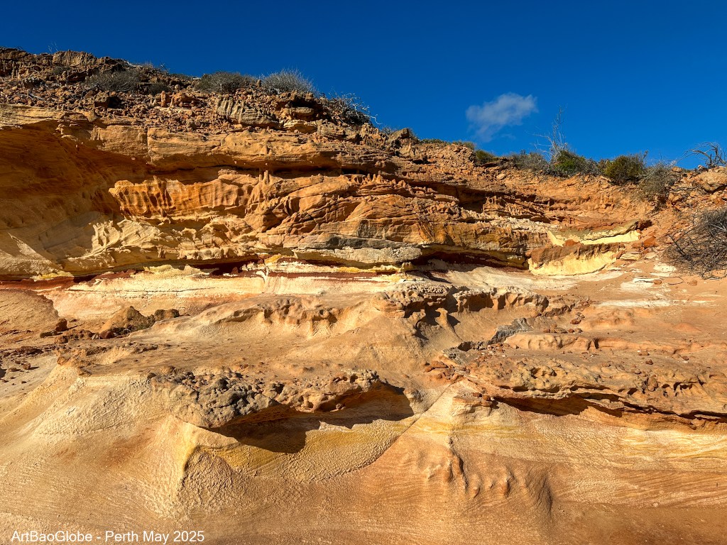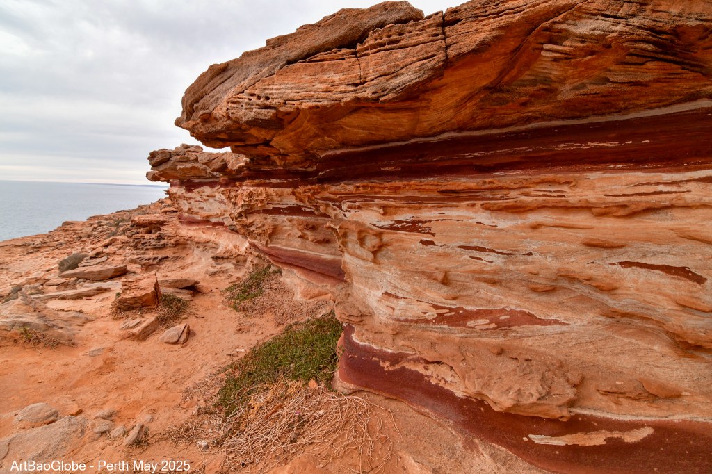 The coastal cliffs of Kalbarri National Park offer some of the most dramatic ocean views in Western Australia, where sweeping panoramas of the Indian Ocean stretch endlessly toward the horizon. The rugged coastline is shaped by time and elements; weathered cliffs, decaying rock faces, and striking formations sculpted by relentless wind and waves. Each lookout reveals a different perspective, a reminder that no two views along the Kalbarri coast are ever quite the same. Rising from the sea, the layered cliffs tell a story millions of years in the making. The rich red tones come from ancient Tumblagooda Sandstone, formed from sand and silt deposited by rivers and tidal flats. Above it sits the younger Tamala Limestone, its pale, rubbly texture adding contrast and depth to this already dramatic landscape. Despite their grandeur, most of the coastal trails are accessible and suitable for visitors of all ages. Easy walks that reward you with unforgettable views and a deeper appreciation of Kalbarri wild beauty. Surrounding them is a resilient coastal ecosystem. The plants here have adapted to harsh conditions, strong winds, intense sun, and salt spray. Their leaves are small, leathery, and often prickly to reduce moisture loss and withstand the elements, while their flowers tend to be smaller and simpler, conserving energy to survive in such an unforgiving environment.