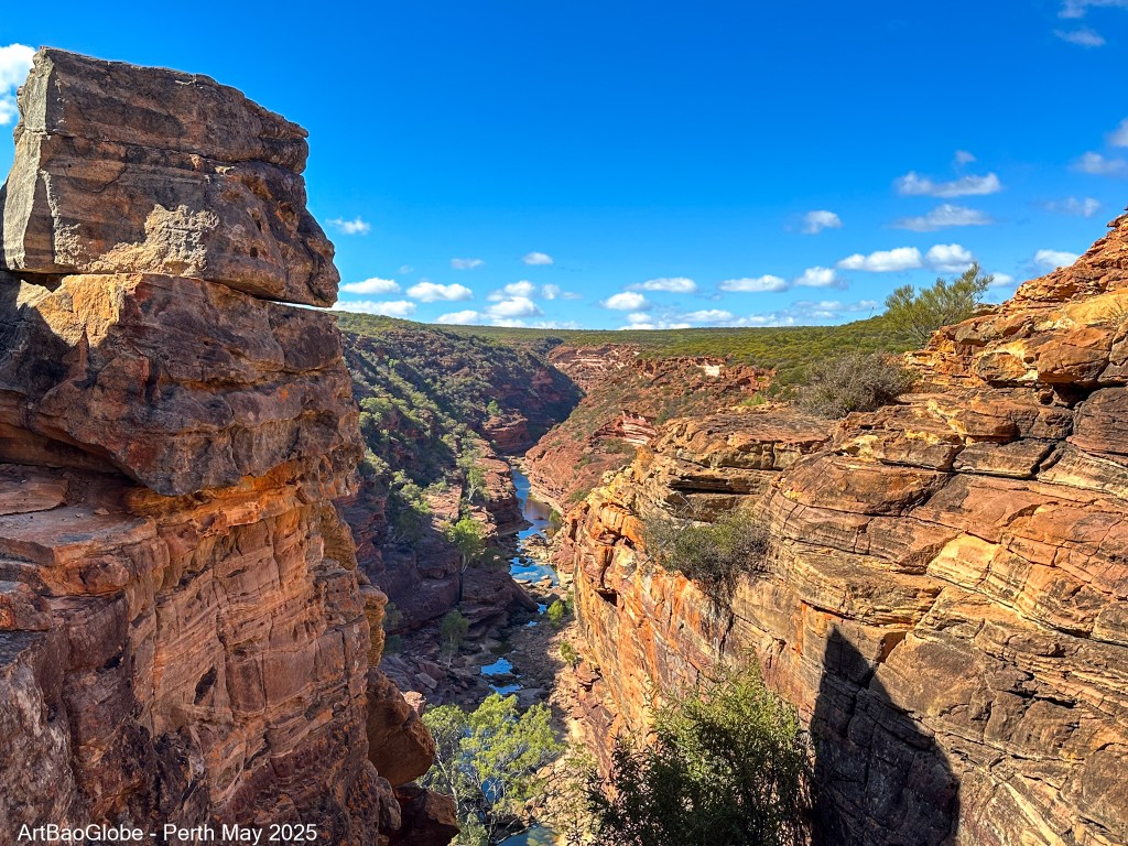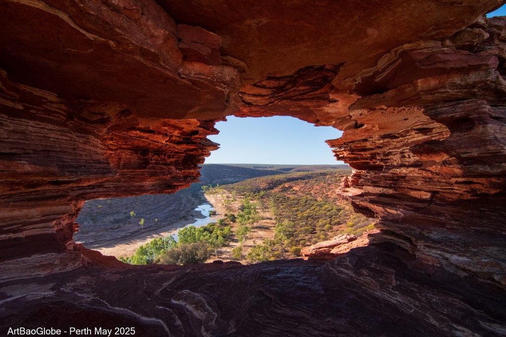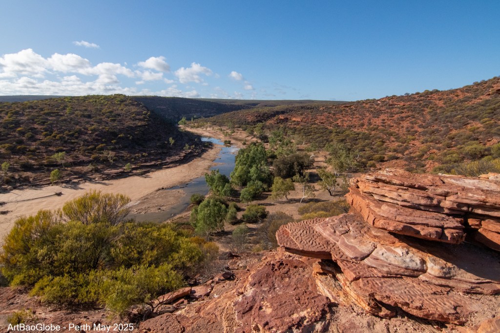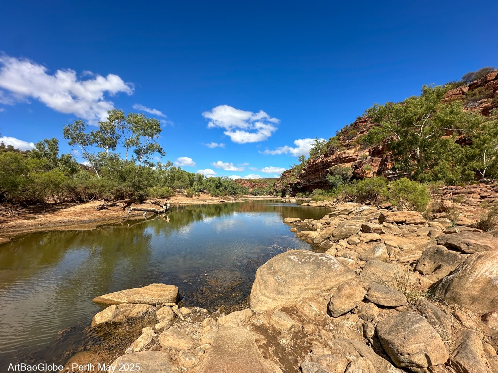 At Ross Graham Lookout, a short 600m return walk brings you down to the edge of the Murchison River, offering a completely different perspective of the gorges. After viewing the landscape from elevated lookouts, standing by the river feels refreshingly intimate. Looking up at the towering gorge walls from below gives a true sense of scale. Something photos can never fully capture. Watching the ancient cliffs rise above you brings a quiet sense of awe and appreciation. A gentle reminder of how special it is to experience Kalbarri from every angle. Above, below, and right in the heart of it.