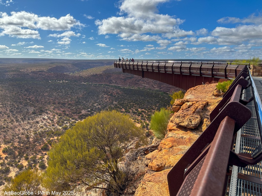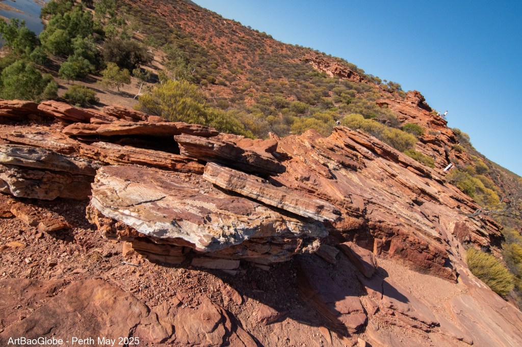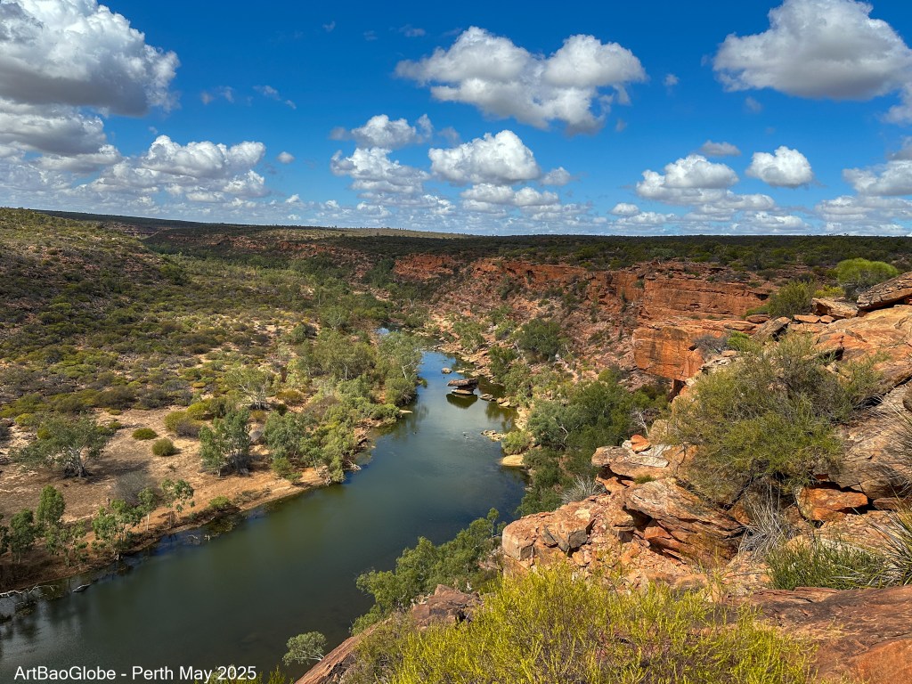 The 1.2km return walk to Z Bend leads to one of the most dramatic lookouts in the park. From the viewing platform, the gorge plunges around 150m below, where red river gums stand in striking contrast against the warm tones of the Tumblagooda Sandstone. The Murchison River winds through the rugged terrain, revealing the immense scale and raw beauty carved over millions of years.