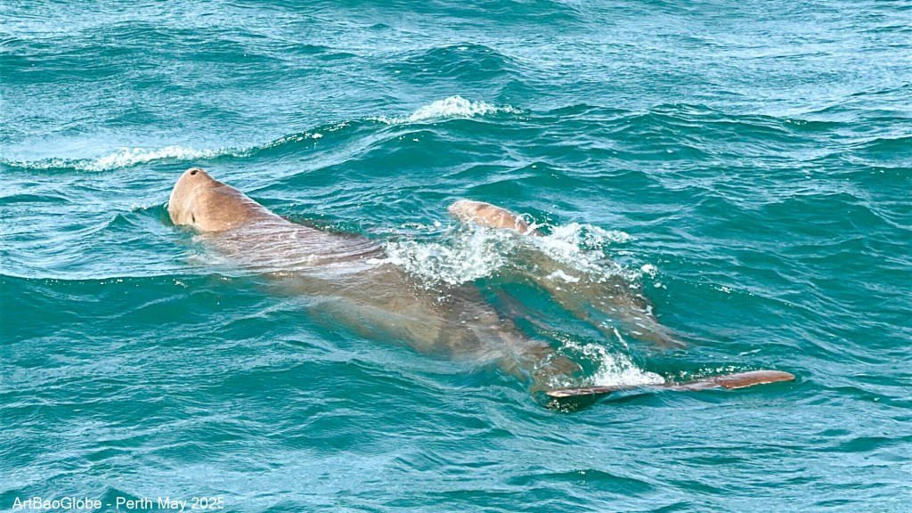 At Monkey Mia, we boarded the Aristocat 2 with Perfect Nature Cruises for a wildlife cruise unlike any other. As the only operator permitted to access certain exclusive zones within Shark Bay, the experience felt intimate and untouched, far from the usual crowds. Beneath the calm waters lies an expansive seagrass meadow. These underwater plains are vital, forming the primary food source for dugongs. Shark Bay is home to more than 10,000 dugongs. Around 10% of the world population, making it one of the best places on Earth to encounter these gentle marine mammals. As we cruised along, dolphins swam effortlessly beside the boat, weaving in and out of the waves. Then came a truly special moment, a mother and calf dugong pair, gliding slowly through the water. Quiet, graceful, and completely undisturbed, it was a rare and humbling sight. Out here, surrounded by open sea and thriving marine life, a reminder of how rich and delicate the ecosystem is and how lucky to witness it in its natural state.